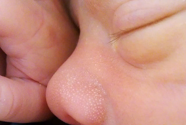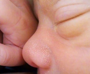 are tiny, pearly-white bumps on a baby's nose, chin, or cheeks .They're caused by dead skin cells trapped in the skin's surface and usually disappear spontaneously within a few weeks.