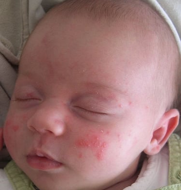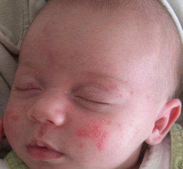 are small, red, and sometimes white-headed bumps that may appear on a baby's face. These acne-like eruptions usually develop on the cheeks, nose, forehead, and sometimes the scalp.